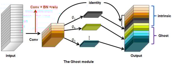 Ghost Net combines linear operations and ordinary convolutions to produce similar feature maps by linearly transforming the feature maps generated by ordinary convolutions [28]. This approach leads to high-dimensional convolution effects, reducing model parameters and computational complexity. The module that combines convolution and linear operations is called the Ghost module. The network structure is shown in Figure 4.