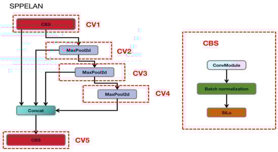SPPELAN is an enhanced module structure based on SPP [29], comprising a CBS module and three Maxpool2d modules for max pooling. The three max-pooling modules are connected sequentially and then fused. This method efficiently extracts the optimal features, passes them sequentially to Concat, and then proceeds through a CBS module to form SPPELAN. The network structure is shown in Figure 5. The SPPELAN module addresses the issue of repetitive feature extraction related to graphs in convolutional networks while maintaining the receptive field unchanged. This significantly enhances the speed of generating candidate boxes, reduces computational costs, and ultimately leads to improved speed.