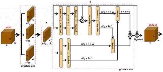 The traditional lightweight approach involves reducing the computational parameters of the model [30]. However, in some cases, parameter reduction may result in feature loss and decreased accuracy. To address this issue, we employ the EMA attention mechanism, an efficient multi-scale attention mechanism that does not necessitate dimensionality reduction [31]. It preserves the information on each channel, reduces computation, reshapes some channels into batch dimensions, and groups channel dimensions into multiple sub-features to evenly distribute spatial semantic features in each feature group. The network structure is shown in Figure 6. Certain channel dimensions are reshaped to batch dimensions to prevent reduction in spatial dimensions through convolution. Local cross-channel interactions are constructed within each parallel subnetwork without reducing channel dimensions, and the output feature maps of the two parallel subnetworks are integrated using cross-spatial learning methods.