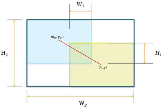 Figure 7 illustrates the smallest bounding box (dark green) and the connection of the center point (red), where the area of the union is as follows: