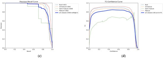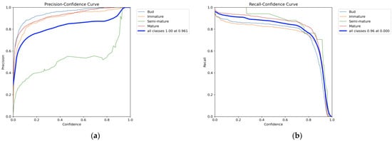 In Figure 8a, the horizontal axis represents the confidence and the vertical axis represents the accuracy. The shape and position of the curve can be used to evaluate the performance and stability of the model, and the curve has a positive slope. The graph illustrates the accuracy of the model at different confidence levels. With an increase in confidence, the accuracy will correspondingly improve, this situation represents an enhanced detection performance of the model, or in other words, a higher degree of accuracy in identifying the maturity of pitaya fruit.
