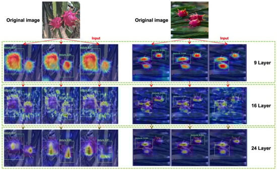 A heatmap is a visualization technique employed for the purpose of object detection. The distribution of the heatmap allows the intensity distribution of the model in the input image to be displayed, thus enabling the identification of important areas within the image. The brightness or darkness of the color indicates the degree of importance attributed to the detection area of the model, thereby indicating the level of confidence the model has in the area being identified as pitaya fruit. The darker or lighter the color, the lower the confidence of the pitaya fruit in the area. As illustrated in Figure 11, the heat maps of the 9th, 16th, and 24th layers were generated. The enhanced model is capable of concentrating on the precise location of the pitaya fruit during detection, thereby facilitating the accurate delineation of the range of the pitaya fruit for prediction.