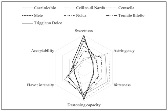 Sensory profiles were obtained considering all six parameters (sweetness, astringency, bitterness, destoning capacity, flavor intensity, and acceptability) assessed by the evaluation panel. The average values of the organoleptic parameters for the seven cultivars evaluated are reported in Figure 1.