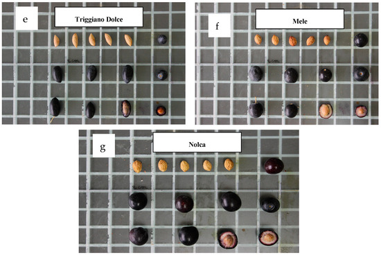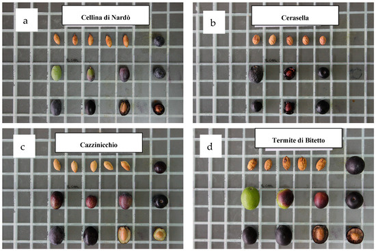 The morphological parameters of the studied olive cultivars are shown in Figure 2. The selected set of morphological parameters was adequate to successfully differentiate each of the drupe and endocarp traits of the seven studied cultivars. Four cultivars, namely, Cerasuola, Termite di Bitetto, Mele, and Nolca, were characterized by a medium–large olive size and rounded shape. The remaining Cellina di Nardò, Cazzinicchio, and Triggiano Dolce had a medium–small size and elongated shape.