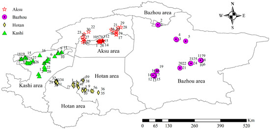 Distribution map of sample points in the main producing areas of HZ fruit. (☆, ⊙, ◇, and △ represents Aksu, Bazhou, Hotan, and Kashi, respectively). The number represents the number of each sampling point.