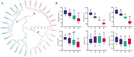 A total of 31 producing areas were clustered. (A) Cluster analysis was used to examine texture quality in 31 producing regions (I, II, III, IV indicate four groups). (B) Four groups of HZ fruit were analyzed for texture quality. Different lowercase letters indicate significant differences at p < 0.05.