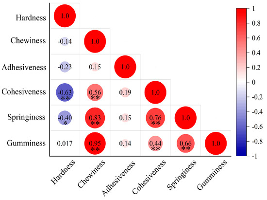 Relationship analysis of six texture indexes of HZ fruit (* p < 0.05, ** p < 0.01).