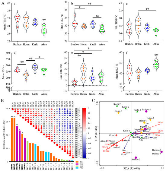 An overview of meteorological data from different regions. (A) Comparison of meteorological parameters of 6–9 months in four HZ-producing locations, * p < 0.05, ** p < 0.01 (a): mean temperature (TEM); (b): maximum temperature (TEM); (c): minimum temperature (TEM); (d): sunshine day (SSD); (e): precipitation (PRE); (f): relative humidity (RHU)). (B) Pearson’s correlation (above the diagonal) and contribution ranking (below the diagonal; * p < 0.05, ** p < 0.01, × indicates no correlation) for 24 climate variables. The bold variables identify the six climate variables selected for RDA analysis; (C) PCA figure using RDA axes 1 and 2.
