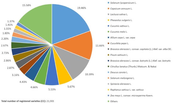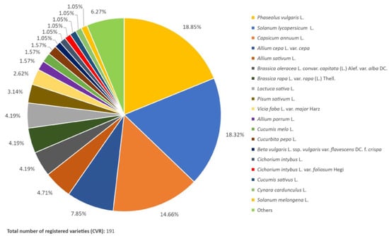 Regarding the 191 conservation varieties registered in Europe, the most-represented species was P. vulgaris, with 36 registered varieties (18.85%), followed by S. lycopersicum and C. annuum, with 35 (18.32%) and 28 (14.46%) registered varieties, respectively. The only other species with more than ten registered varieties was onion (Allium cepa L. var. cepa), with 15 varieties (7.85%) (Figure 3).