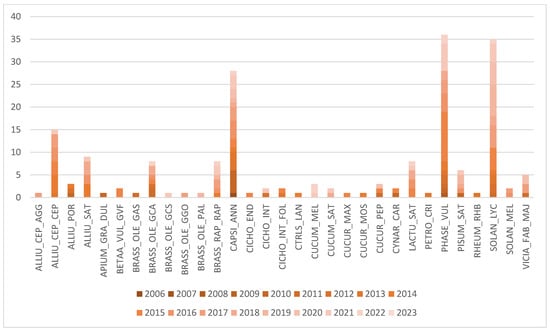 The greatest numbers of years with associated entries occurred in the three most-represented species (P. vulgaris, S. lycopersicum, and C. annuum), for which conservation varieties were recorded for twelve, eleven and twelve years, respectively. Registrations of varieties of onion, the 4th-most-CVR-registered species, were instead all concentrated in the years from 2013 to 2017, with only one later entry, in 2021.