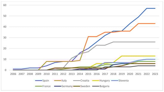 Considering the historical evolution of the CVR from 2006—the year of the first CVR registration—to the present, until 2010, Spain was the only European country with CVR registrations. In 2010, Italy produced eight of the 43 current CVR registrations, becoming the top European country for registered varieties. This supremacy endured for only three years because in 2013, Croatia, with a total of 11 registered varieties, established itself as the top country in Europe. Thereafter, the leading position alternated between Italy (from 2015 to 2019) and Spain (in 2014 and from 2020 to present days).