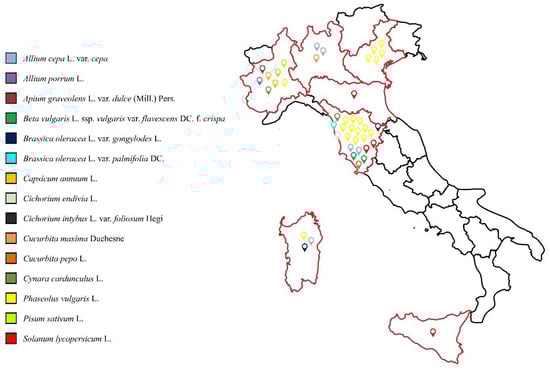 Furthermore, the Italian production data were analysed. In that context, in the absence of a dataset showing the production (expressed in hectares) of Italian conservation varieties, in order to evaluate the potential application of the CVR for commercialization of Italian vegetable landraces, it was decided that the maximum number of cultivable hectares allotted to each conservation variety—derived from Annex X of Legislative Decree 20/2021 [32]—would be compared with the number of hectares allotted to the same species in the reference area. To do this, the public-access database of the Italian National Institute of Statistics (ISTAT) was consulted, considering the 2022 production data for open-field vegetable species in Italy as a whole and by region. These data are collected by ISTAT following an estimation-type methodology. Estimates are made based on evaluations by local experts in the field who are located throughout the area, and the crops surveyed are different for each month and consider the phenological stage of cultivation. For this reason, when using ISTAT data, it is always preferable to use data from the year prior to the research. These data—the maximum number of cultivable hectares per conservation variety and the hectares cultivated in each Italian region and in all of Italy—were compared, approximating the region of origin of each conservation variety to the corresponding regional territory as there were no specific cultivation data for each province and/or municipality associated with the specific conservation variety registered.