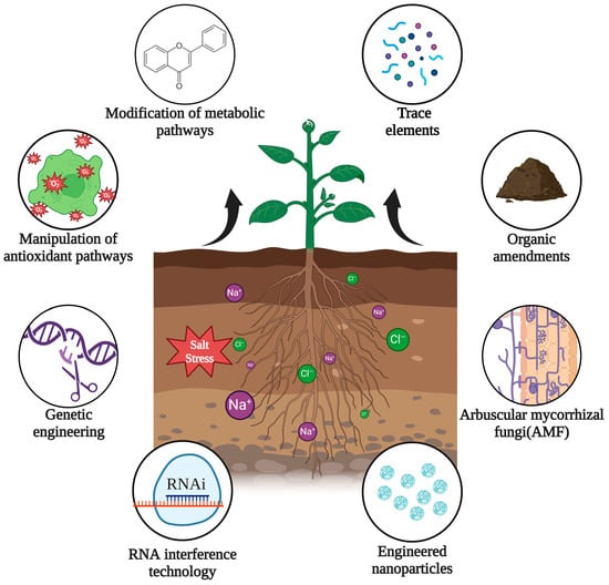 The innovative approaches that scientists are investigating to improve plants exposed to salinity stress adaptation include the modification of metabolic pathways, manipulation of antioxidant pathways, advancements in genetic engineering on salinity stress, RNA interference technology, engineered nanoparticles to alleviate salinity, arbuscular mycorrhizal fungi (AMF) for salt stress alleviation, the application of organic amendments, and trace elements for improving plant salt stress (Figure 1). These approaches facilitate the allocation of greater resources toward developing and enhancing plant salinity tolerance mechanisms, which will be discussed in detail in the subsequent sections [22]. This enhances our understanding of how most agriculture crops can be improved to adapt to salinity stress conditions; for instance, employing the genetic variability of numerous agricultural crops in different gene banks to develop stress-tolerant crops. These approaches offer a sustainable method of mitigating salt stress.