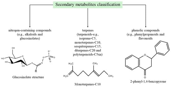Generally, secondary metabolites are not a basic requirement for plant cell functioning but are involved in the crucial role of protecting plants exposed to salinity conditions. Plant species use a considerably different level of secondary metabolites when exposed to the environment [49,50,51]. A significant proportion of these secondary metabolites have been grouped into three main categories (Figure 2), including nitrogen-containing compounds (e.g., alkaloids and glucosinolates), terpenes (terpenoids—e.g., isoprene-C5, monoterpenes-C10, sesquiterpenes-C15, diterpenes-C20, and polyterpenoids-C5xn), and phenolic compounds (e.g., phenylpropanoids and flavonoids) [52,53,54].