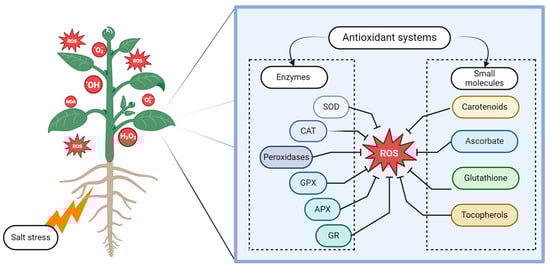 Plants have evolved a complex antioxidant system to prevent cellular damage caused by salinity stress (Figure 3). The primary components of this system are carotenoids, ascorbate, glutathione, and tocopherols, in addition to the following enzymes: superoxide dismutase (SOD), catalase (CAT), glutathione peroxidase (GPX), and peroxidases (Figure 3) [62]. Furthermore, enzymes involved in the ascorbate–glutathione cycle, such as ascorbate peroxidase (APX) and glutathione reductase (GR), have been found to lessen the adverse effects of salinity stress (Figure 3) [63].