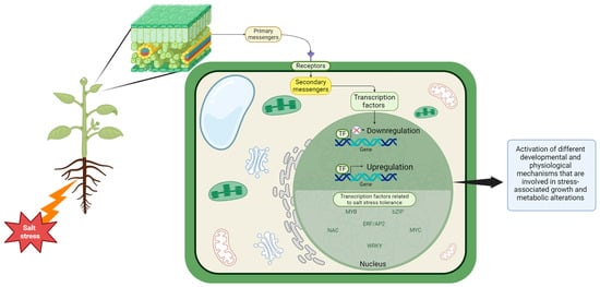 The mechanism of regulation of gene expression via transcription factors as a response to salt stress, that agricultural cultivars exhibited in differential gene regulation with diverse functions in response to salinity stress conditions; TF—transcription factors; ⊗—suppression of the gene expression. Created in BioRender.com.