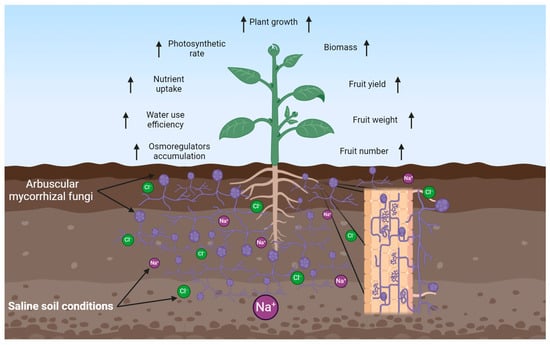 Plant root systems are mostly colonized by arbuscular mycorrhizal, which influence growth and development, improving the resilience of plants exposed to saline stress conditions (Figure 7). Numerous findings have described the role of AMF in improving plant defenses against salinity stress. These findings have demonstrated that increases in nutrient uptake, osmoregulator accumulation, improvements in photosynthetic rate, and increases in water use efficiency are associated with the mitigation of saline soil stress conditions by AMF [111,112,113].