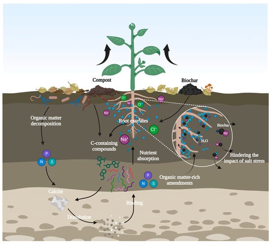 The recent use of various types of organic matter alterations to promote the growth of plants exposed to salt stress has demonstrated a decrease in the oxidative and osmotic stress of agricultural plants exposed to saline conditions. This reduction has been attributed to increased microbial activities [122,123]. This was achieved by enhancing the disposal of energy-rich C-containing compounds in the organic amendments, allowing soil microorganisms to biosynthesize osmolytes to mitigate the effects of osmotic pressure from high-salinity conditions [124]. Organic soil amendments have been shown to offer considerable benefits for saline soil ecosystems when used in conjunction with compost [125]. It has been demonstrated that incorporating organic matter into saline soils can intensify the dissolution percentage of calcite (CaCO3) by facilitating the fast generation of carbonic acid, thereby hastening the binding of small particles within the matrix. This results in the formation of substantial aggregates, which remain stable in the aqueous environment. A wide range of organic amendments for soil, including manure composites and biochar, have been subjected to rigorous investigation to enhance the physical and chemical properties of saline–alkali soil, thereby lowering salinity, pH, and mitigating salinity stress conditions (Figure 8) [126]. For example, recent studies have indicated that biochar can result in notable differences in water content and movement within different layers and depths of the soil [127]. Organic matter-rich amendments incorporated into the soil have been demonstrated to enhance soil aggregation and improve the water-holding capacity, thereby hindering the impacts of salt stress on productivity [128,129]. For example, the use of biochar has been demonstrated to increase soil water content while reducing salinity concentrations by up to 22% [130,131]. Importantly, biochar increased the availability of soil potassium (K) concentrations by approximately 89% and foliar K concentrations up to 25% [131]. It is known that biochar possesses the ability to bind potentially toxic salt ions (Na+) at different scales [132]. This binding occurs due to the biochar’s inherent absorptive properties, which are further augmented by its enormously high porosity, cation exchange capacity, and large surface area [132]. Moreover, it has been shown that organic amendments can enhance 48, 39, and 84% of the root fresh weight in maize plants under salt stress [133]. The incorporation of organic amendments into marginal soils has been demonstrated to enhance the growth and development of agricultural crops, particularly those exposed to salinity stress conditions, thereby ensuring the sustainability of production. Thus, it is important to apply biochar to reduce salinity and support sustainable food production under changing climate conditions.
