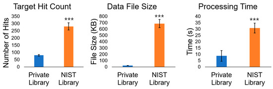 Private library vs. NIST library: detection, file size, and speed. Comparison of library performance between the private library and NIST library. The average number of identified targets, report file size, and processing time were measured in equal running conditions. Each value is exhibited by a mean value and standard deviation (n = 6). Triple asterisks (***) indicate a highly significant difference based on Student’s t-test (p < 0.001).
