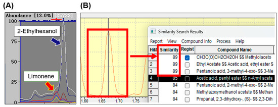Demonstration of the necessity of AMDIS. The figure displays a screenshot of AMDIS and GCMS Solution software during the analysis of actual strawberry VOC data. (A): Limonene remains obscured by 2-ethylhexanol if deconvolution is not performed. The white line represents the total ion chromatogram, while the colored solid lines represent various individual ion chromatograms. (B): The similarity search results for a single peak showing three compounds with identical similarity values, causing confusion in the identification. The red boxes display the target peak along with the mass library similarity scores for that peak.