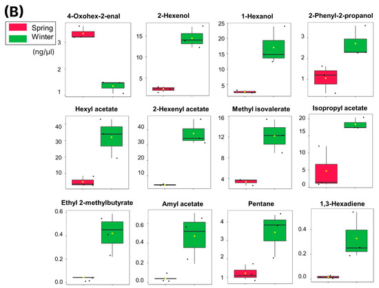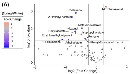 It is well-documented that strawberries grown in warmer temperatures often exhibit lower fruit quality compared to those grown in cooler conditions [27]. While much research has focused on sugar content and its impact on fruit quality, there is a significant lack of studies examining the role of aroma in this context. To address this research gap, we collected and compared the volatile organic compound (VOC) profiles of strawberries from various cultivars, harvested in both winter and spring. This study aims to offer practical insights into how seasonal variations affect strawberry aroma and, consequently, fruit quality, which could be valuable for optimizing cultivation practices and improving marketable quality in the strawberry industry. Volatile organic compounds (VOCs) that exhibited significant changes between seasons (p-value < 0.05 and fold change > 2.0) were identified (Figure 4). Overall, a reduction in volatile compounds was observed in spring strawberries compared to winter strawberries. Notably, only 4-oxohex-2-enal, the aldehyde, showed a significantly higher concentration in spring strawberries compared to winter strawberries. The following compounds decreased in spring strawberries: three alcohols (2-hexenol, 1-hexanol, and 2-phenyl-2-propanol), six esters (hexyl acetate, 2-hexenyl acetate, methyl isovalerate, isopropyl acetate, ethyl 2-methylbutyrate, amyl acetate), one alkane (pentane), and one alkene (1,3-hexadiene).