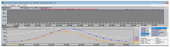 However, it is worth noting that compared to other deconvolution software, AMDIS tends to identify false positives more frequently [17]. Therefore, it is essential to include a target library containing the substances under investigation when utilizing AMDIS. The use of a target library not only reduces the occurrence of false positives but also significantly enhances the accuracy and reliability of compound identification, especially in complex matrices. The increased accessibility afforded by the AMDIS library for research into strawberry aroma holds promise for its versatile application. This includes the potential for early disease prediction in plants through VOC analysis [18] and the facilitation of high-quality breeding practices.