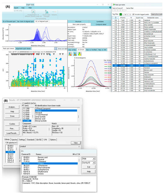Six identical strawberry VOC chromatogram datasets (Supplementary File S1) were analyzed using both AMDIS 2.73 and LabSolutions 4.50 GCMS Solution software (Shimadzu, Japan). For AMDIS analysis, the following settings were applied: a ‘Minimum Match Factor’ of 75, ‘Deconvolution settings of Adjacent Peak Subtraction’ set to none, ‘Resolution set’ to high, ‘Sensitivity’ set to low, and ‘Shape Requirements’ set to medium. The NIST 17 mass spectral library was utilized as the reference library for compound identification. Statistical calculations were performed using IBM SPSS Statistics 27 software.