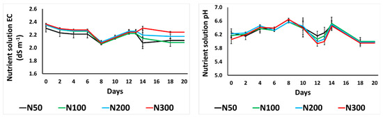 The EC of the NS fluctuated from 1.9 to 2.4 dS m−1 among the treatments of different N concentrations in this study (Figure 1). The pH levels of the NS fluctuated in a similar manner for all the examined N concertation treatments, as it was controlled daily.