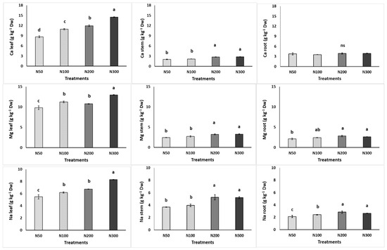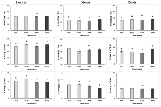 Effect of increasing nitrogen (N) concentration (50, 100, 200, and 300 mg L−1; as N50, N100, N200, and N300) in the nutrient solution on the content of macronutrients in the leaves, stems, and roots of purslane plants grown hydroponically in the NFT system. Significant differences (p < 0.05) among N concentrations are indicated by different letters; ns indicates non-significant. Error bars show standard error—SE (n = 4).