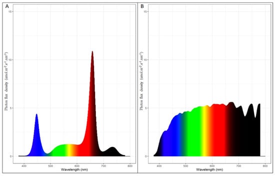 Photosynthetic active radiation (PAR) is the wavelengths of light within the visible range of 400–700 nm, which drives photosynthesis. The PPFD is the amount of PAR landing on the plant in a specific area and time. PPFD was monitored for each treatment using analog full-spectrum quantum sensors SQ-500 (Apogee Instruments, Logan, UT, USA). Each sensor was attached to a data logger, and PPFD was measured every 150 s and averaged every 900 s from preconditioning to 14 wab. DLI was calculated for each treatment using the formula: