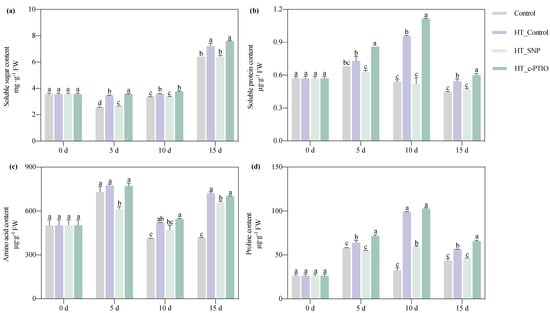 Effects of NO on soluble sugar content (a), soluble protein content (b), amino acid content (c), and proline content (d) of pepper seedlings under high-temperature stress. Each value is the mean ± standard error (n = 3), and the error bars represent the standard error. Bars with a different letter within a sampling date are significantly different (p < 0.05).