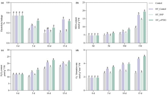 HT stress significantly increased electrolytic leakage by 34.37% and 123.63% on days 5 and 15, respectively. MDA content, H2O2 content, and O2.− formation rate increased by 13.31–85.07%, 16.30–32.93%, and 24.45–82.13% during the entire pepper seedling treatment period, respectively, compared with the control (Figure 3). Compared with the HT Control, exogenous SNP significantly decreased electrolytic leakage by 13.51% and 50.35% at 5 and 15 days, MDA content, H2O2 content, and O2.− formation decreased rate by 11.81–18.30%, 9.04–16.36%, and 19.80–42.76%, respectively, during the entire pepper seedling treatment period under HT stress. Electrolytic leakage increased by 26.59% on day 5, and the MDA, H2O2, and O2− formation rate increased by 11.20–20.43%, 5.50–14.79%, and 1.92–8.80%, respectively, during the entire pepper seedling treatment period of exogenous c-PTIO under HT stress, compared with that of the HT Control.