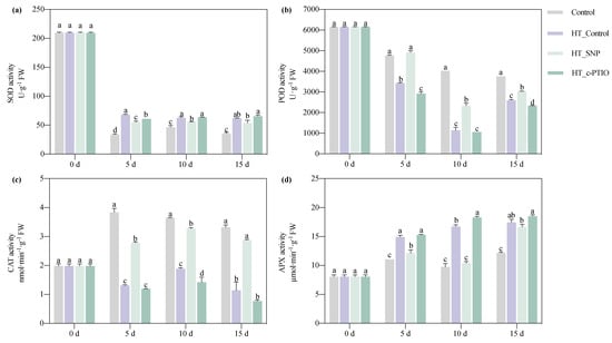Effects of NO on SOD (a), POD (b), CAT (c), and APX (d) of pepper seedlings under high-temperature stress. Each value is the mean ± standard error (n = 3), and the error bars represent the standard error. Bars with a different letter within a sampling date are significantly different (p < 0.05).