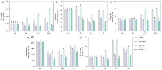 Compared with the control, soluble sugar and proline contents were significantly increased by 6.44–34.89% and 11.91–206.11%, respectively, during the entire treatment period, and soluble protein and amino acid contents were decreased by 76.85% and 21.64%, and 25.98%, and 72.88% on days 10 and 15, respectively, in pepper seedlings under HT stress (Figure 2b,c). Compared with the HT Control, exogenous SNP significantly decreased soluble sugar, soluble protein, and proline content by 5.80–23.21%, 13.50–45.55%, and 15.47–40.30%, respectively, during the entire treatment period, and amino acid content decreased by 20.81% and 8.77% on days 5 and 15, respectively, in pepper seedlings under HT stress. Compared with the HT Control, exogenous c-PTIO significantly increased soluble sugar content by 2.97% on day 5 and 5.12% on day 10, soluble protein content increased by 10.43–17.81% during the entire treatment period, and proline content increased by 10.12% and 15.84% on days 5 and 15, respectively, in pepper seedlings under HT stress.