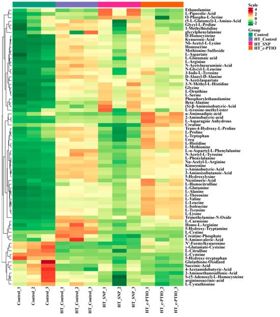 PCA results revealed differences in the metabolomes among the four sample groups (Figure S4). According to the dynamic distribution map of the differential metabolite content, the five metabolites that exhibited the largest increase in the HT Control vs. Control comparison group were N-acetylaspartate, N-acetylneuraminic acid, L-cysteine, L-lysine, and glycine. Conversely, the five metabolites showing the largest decrease in the same comparison group were L-cysteine, γ-glutamic-cysteine, N′-formylkynurenine, 5-hydroxy-tryptophan, and succinic acid (Figure 7a). In the HT SNP vs. HT Control comparison group, the most upregulated metabolites were beta-alanine, γ-glutamate-cysteine, O-phospho-L-serine, ethanolamine, and phosphorylethanolamine. Conversely, the most downregulated metabolites were L-cysteine, creatine, urea, kynurenine, and creatine phosphate (Figure 7b). In the HT c-PTIO vs. HT Control comparison, the five most highly upregulated metabolites were α-glutamate-cysteine, N′-formylkynurenine, L-asparagine anhydrous, L-asparagine anhydrous, and α-aminoadipic acid, whereas the five most highly downregulated metabolites were L-cystine, 5-hydroxy-tryptamine, creatine phosphate, D-alanyl-D-alanine, and N-acetylneuraminic acid (Figure 7c).