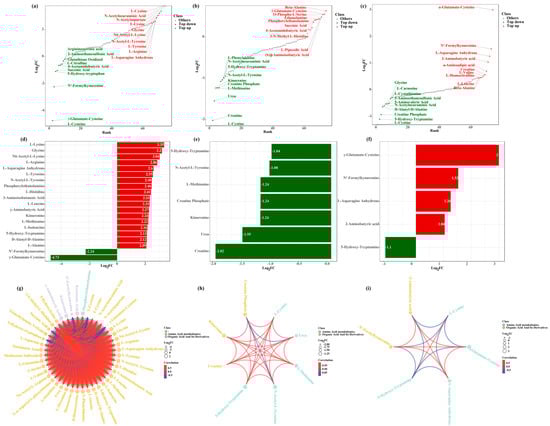 Differential metabolite screening. (a–c) show the dynamic distribution of differential metabolic content, (d–f) present the bar chart of differential multiples, (g–i) display the chord diagram of differential metabolites. (a,d,g) HT_Control_vs_Control, (b,g,h) HT_SNP_vs_HT_Control, (e,f,i) HT_c-PTIO_vs_HT_Control.