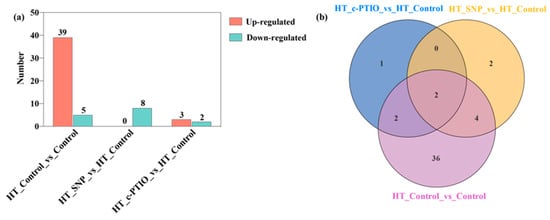 In the HT Control vs. Control, HT SNP vs. HT Control, and HT c-PTIO vs. HT Control comparisons, 44, 8, and 5 differentially accumulated metabolites were identified, respectively (Figure 8a). Venn diagram analysis revealed that in the HT Control vs. Control comparison, 36 metabolites differentially accumulated during the treatment. Two metabolites exhibited differential accumulation owing to SNP treatment, whereas only one metabolite was induced by c-PTIO treatment under HT stress (Figure 8b). Based on the KEGG pathway analysis, the metabolic pathways that were significantly enriched in the HT Control vs. Control, HT SNP vs. HT Control, and HT c-PTIO vs. HT Control comparisons were cyanoamino acid, biotin, and biotin metabolism, respectively (Figure 9a–c). Cluster analysis indicated that SNP treatment resulted in significant differential accumulation of various metabolites during the treatment period, including organic acids and their derivatives (creatine phosphate, kinurenine, and creatine) and amino acid metabolomics (L-cysteine, 5-hydroxy-tryptamine, L-methionine, urea, and N-acetyl-L-tyrosine) (Figure 10a–c).