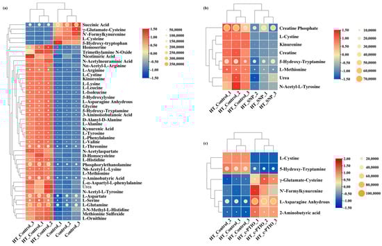 Heat map analysis of differential metabolites between comparison groups: (a) HT_Control_vs_Control, (b) HT_SNP_vs_HT_Control, and (c) HT_c-PTIO_vs_HT_Control.