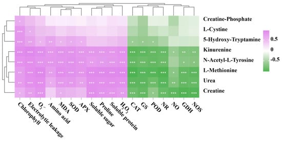 Based on the biochemical indicator-metabolite correlation heat map, chlorophyll content, electrolytic leakage, O2.−, MDA, soluble sugar, proline, soluble protein, and H2O2 content exhibited significant positive correlations with kinurenine, N-acetyl-L-tyrosine, L-methionine, and urea (Figure 11). Conversely, CAT, GS, POD, NR, GDH, and NOS activities were significantly negatively correlated with kinurenine, N-acetyl-L-tyrosine, L-methionine, urea, and creatine levels. NO content was significantly negatively correlated with kinurenine, L-methionine, urea, and creatinine.