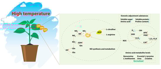 Nitric oxide (NO) is a small bioactive molecule that acts as a signaling mediator in various physiological processes in plants, including abiotic stress responses. Exogenous NO significantly affects the antioxidant capacity of plants under various abiotic stress conditions, thereby enhancing stress tolerance. NO treatment significantly increases the activity of SOD, POD, and CAT, effectively reducing oxidative damage in tomatoes [15]. Exogenous NO increases the activities of SOD, CAT, and POD, eliminating ROS generated at HT in cucumbers [16]. Exogenous NO enhances the activities of nitrate reductase (NR) and nitrite reductase (NiR) in Arabidopsis under HT stress, leading to increased NO synthesis and improved resistance to oxidative damage [17]. Exogenous NO plays a crucial role in promoting amino acid metabolism and maintaining maize growth under drought conditions [18]. This is achieved by increasing the activities of NR and NiR, which in turn boosts the activities of glutamine synthetase (GS) and glutamate dehydrogenase (GDH) [19]. Similarly, exogenous NO enhances NR and NiR activity in rice, increases NO synthesis, regulates GS and GDH activity, improves amino acid metabolism, and enhances salt-stress tolerance [20].