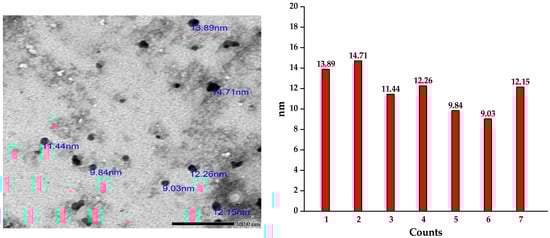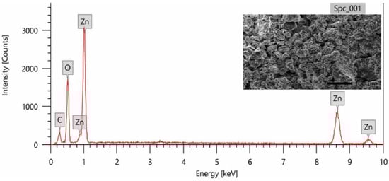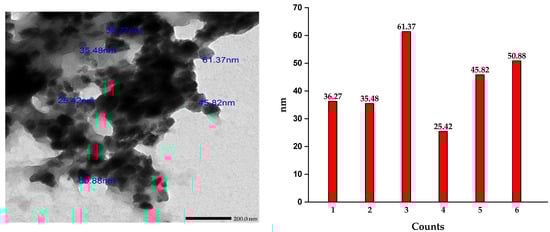 TEM image analysis showed the different shapes and confirmed that an organic layer derived from the guava extract covers the nanoparticles. In addition, TEM analysis also revealed the different shapes for ZnNPs with a size from 25.42 to 61.37 nm (Figure 1) and FeNPs with a size from 9.03 to 14.71 nm (Figure 2). EDX analysis was performed, and its results are presented in Figure 3 and Figure 4. The chemical composition of samples indicates the presence of Zn, Fe, O, and others. The spectra emphasize the impurities in the samples, but the C peak coming from the tape was used to fix the sample. Also, the elements other than Zn and Fe are due to the extracts that were used in the synthesis of ZnNPs and FeNPs. The zeta potential of green ZnNPs and FeNPs exhibited negative values of −7.67 and −8.71, respectively, as indicated in Figure 5 and Figure 6.