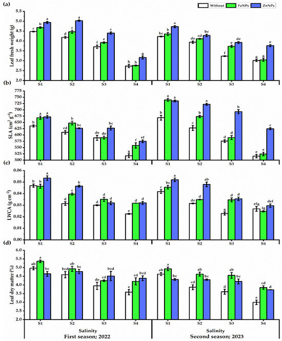 Effects of irrigation water salinity and foliar applications of ZnNPs and FeNPs on (a) leaf fresh weight; (b) SLA, specific leaf area; (c) LWCA, leaf water content area; and (d) leaf dry matter of cowpea during seasons 2022 and 2023. Different bars indicate the values of means ± SE, n = 6; different letters indicate significant differences (p ≤ 0.05) between the treatments after performing Tukey’s test.