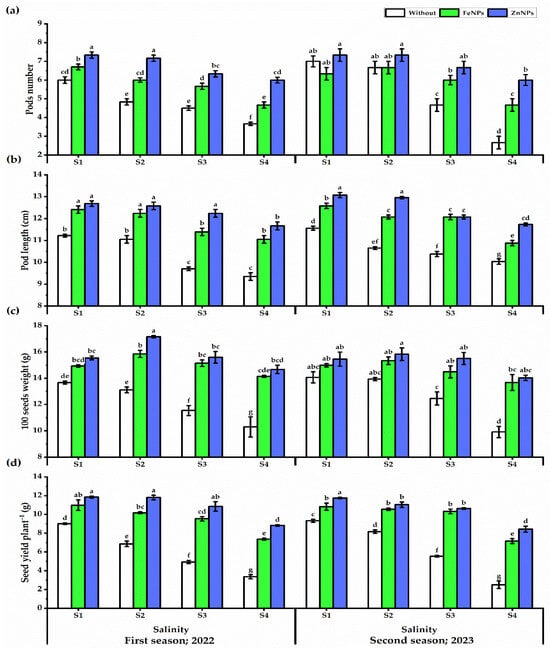 Effects of irrigation water salinity and foliar applications of ZnNPs and FeNPs on (a) pod number; (b) pod length; (c) 100 seed weight; and (d) seed yield plant−1 of cowpea during seasons 2022 and 2023. Different bars indicate the values of means ± SE, n = 6; different letters indicate significant differences (p ≤ 0.05) between the treatments after performing Tukey’s test.