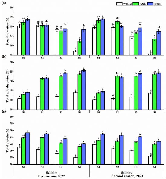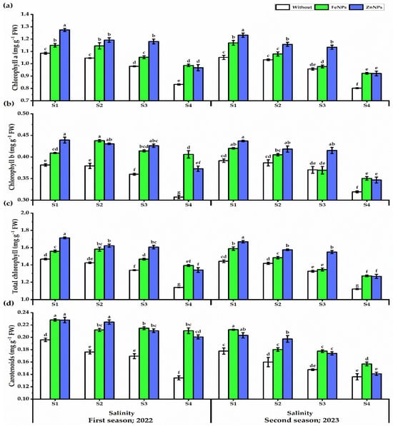 Effects of irrigation water salinity and foliar applications of ZnNPs and FeNPs on (a) chlorophyll a; (b) chlorophyll b; (c) total chlorophyll; and (d) carotenoids of cowpea during seasons 2022 and 2023. Different bars indicate the values of means ± SE, n = 6; different letters indicate significant differences (p ≤ 0.05) between the treatments after performing Tukey’s test.