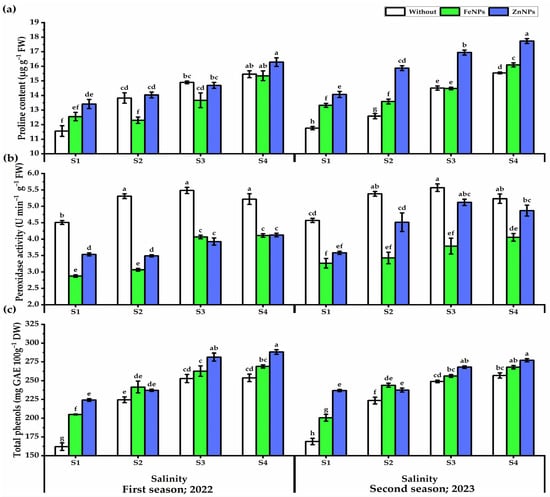 The data presented in Table S6 indicate a significant and positive correlation between salinity level and proline content in the cowpea leaves, as proline content significantly increased with increasing salinity level. Foliar spraying with green NPs significantly enhanced proline content, and ZnNPs showed the highest proline content, followed by FeNP application. When it comes to the interaction influence, the greatest proline values (16.29 and 17.74 µg g−1 FW for the first and second seasons, respectively) were exhibited by ZnNPs × S4 plants, while the lowest proline mean values (11.56 and 11.76 µg g−1 FW for the first and second seasons, respectively) were produced by the un-foliar sprayed plants cultivated under the S1 conditions (Figure 10).