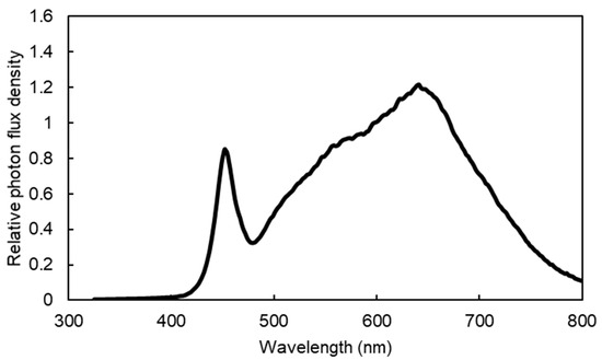 “Frillice” lettuce (Lactuca Sativa L.; Mifko Seed Corp., Hanam, Republic of Korea) was used as a plant material in this study. The lettuce seedlings were cultivated for 11 days after sowing (DAS) in “Growform” media (Smithers-Oasis Korea Co. Ltd., Chunam, Republic of Korea). To create differences in seedling growth, we varied the frequency of sub-irrigation; every two days (2DI) and every three days (3DI). The Yamazaki lettuce nutrient solution, with pH of 6.0 and EC of 1.0 ds m−1, was employed for seedling production. The cultivation room in the plant factory was maintained at air temperature of 24/22 °C and relative humidity of 65 ± 5%. White LEDs (Futuregreen Co. Ltd., Yongin, Republic of Korea) were used as a light source, and the light intensity and photoperiod were set at 180 μmol·m−2·s−1 and 16/8 h (light/dark), respectively. Figure 1 shows the spectral distribution of LEDs used in this study.
