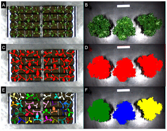 Images of ‘Frillice’ lettuce seedlings and mature plants taken with PIMS (A,B), separated from their background (C,D), and detected individually using ENVI program (E,F).