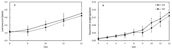 Changes in leaf area (A) and shoot fresh weight (B) of ‘Frillice’ lettuce seedlings during the period of seedling production in a plant factory. The seedlings were sub-irrigated every two (2DI) or three (3DI) days and sampled for 12 DAS.