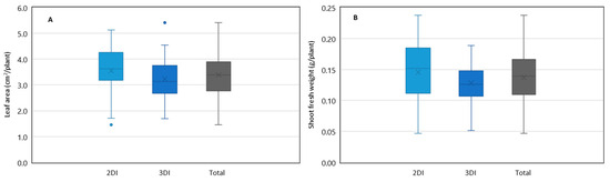 At 12 DAS, the lettuce seedlings irrigated every two days showed a higher leaf area and shoot fresh weight than those irrigated every three days; however, no significant differences were observed between the irrigation regimes (Figure 4). The leaf area and shoot fresh weight exhibited no observable difference between the irrigation treatments until 8 DAS, and there was a tendency for growth to be higher in the 2DI treatment from 9 DAS. In the distribution of growth parameters by irrigation regimes, it was revealed that the 3DI treatment exhibited lower Q4 (the maximum) and Q3 (the highest 25% of the data) values for leaf area and shoot fresh weight than the 2DI treatment (Figure 5). The Q3 value of shoot fresh weight in the 3DI treatment was found to be lower than the median value for the 2DI treatment. The leaf area and shoot fresh weight for all irrigation treatments exhibited a range of 1.45–5.42 cm2/plant and 0.047–0.238 g/plant, respectively.