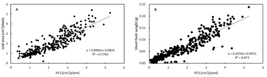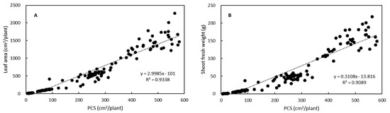 Correlation between PCS and leaf area (A) and shoot fresh weight (B) of ‘Frillice’ lettuce seedlings.